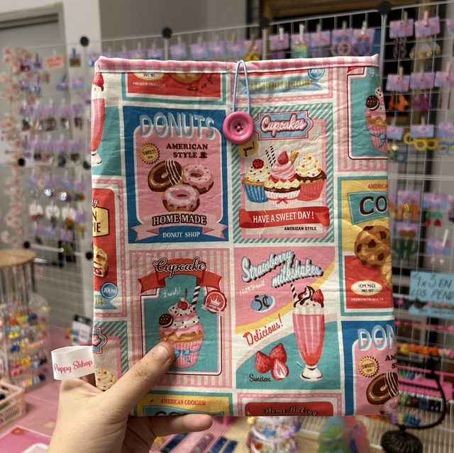 Funda de libro hecha a mano acolchada, con botón y elástico.
